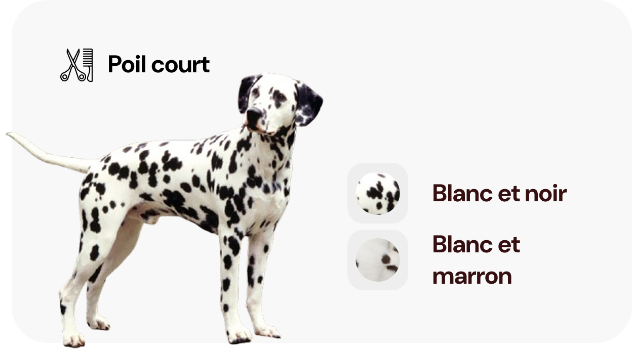 Les couleurs fréquentes pour le pelage du Dalmatien incluent :