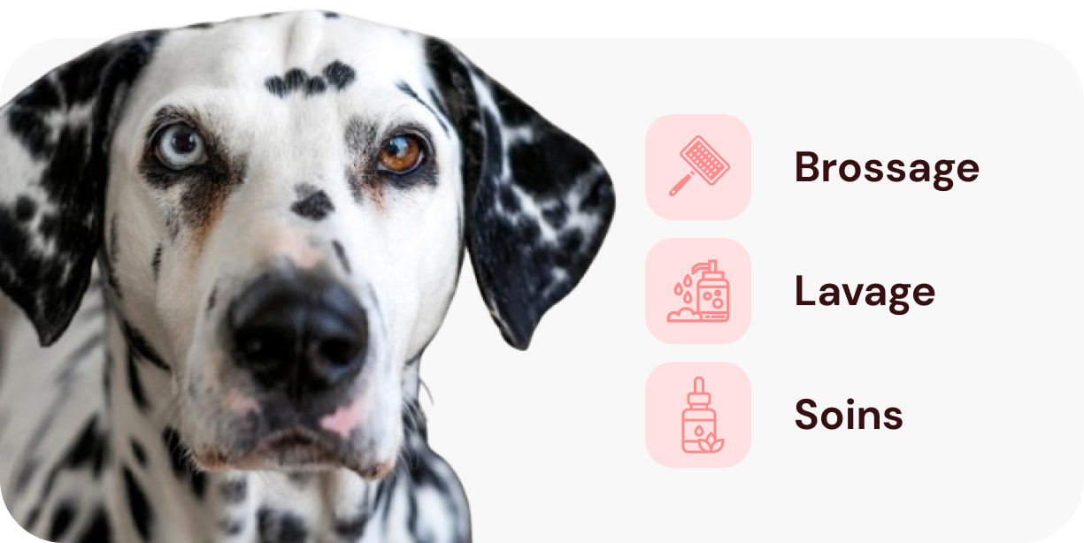 Il est rare qu'un Dalmatien ait une odeur désagréable, et si c'est le cas, cela peut être lié à l'odeur du poil mort. Afin de maintenir la qualité du poil, le brossage régulier est recommandé. De plus, pour améliorer la santé du poil de votre Dalmatien, des soins tels que la levure de bière pour favoriser la repousse, l'huile de saumon pour rendre le poil doux et brillant, ainsi que le dermoscent pour nettoyer le poil et renforcer la couche protectrice de sébum sur la peau peuvent être bénéfiques.